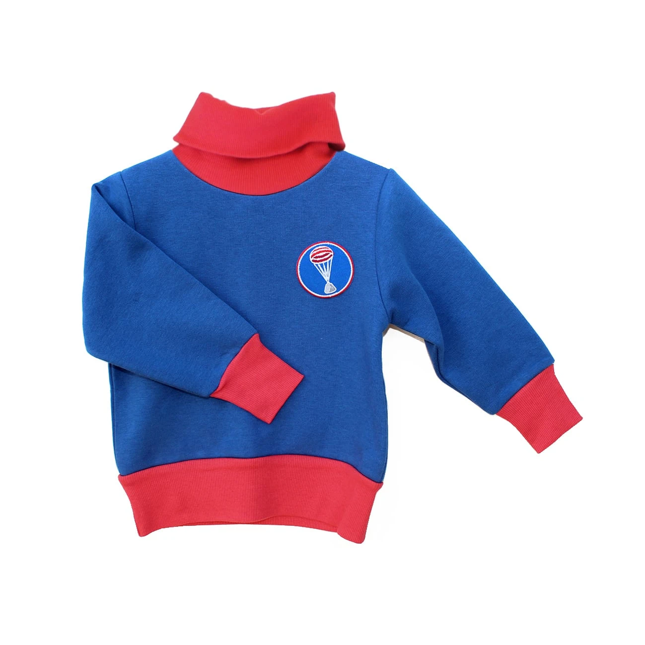 Der bequeme und tobe taugliche Rollkragenpullover aus Sweater-Material mit seiner flauschigen Innenseite, hält kuschelig warm. Der elastische Rollkragen hält den Hals schön warm, ohne dabei einzuengen. Die dunkelblauen Bündchen aus elastischer Baumwollrippe, bilden einen wunderbaren, schlichten Kontrast zum kräftigen Blau des Pullovers. Auf der linken Seite befindet sich ein hochwertiger Aufnäher im Retro-Look, mit einem gestickten Fallschirm. Da Kinder Farben lieben, wird das Anziehen ab jetzt zum Kinderspiel.